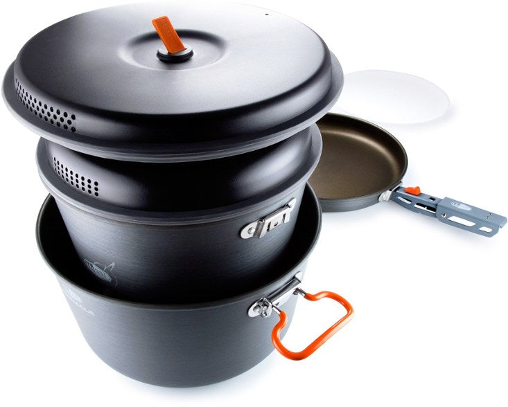 ชุดหม้อ GSI Pinnacle Base Camper Large ประกอบด้วย หม้อ Aluminum Hard Anodize เคลือบ Teflon Radiance อย่างดี ขนาด 5 ลิตร และ 3 ลิตร