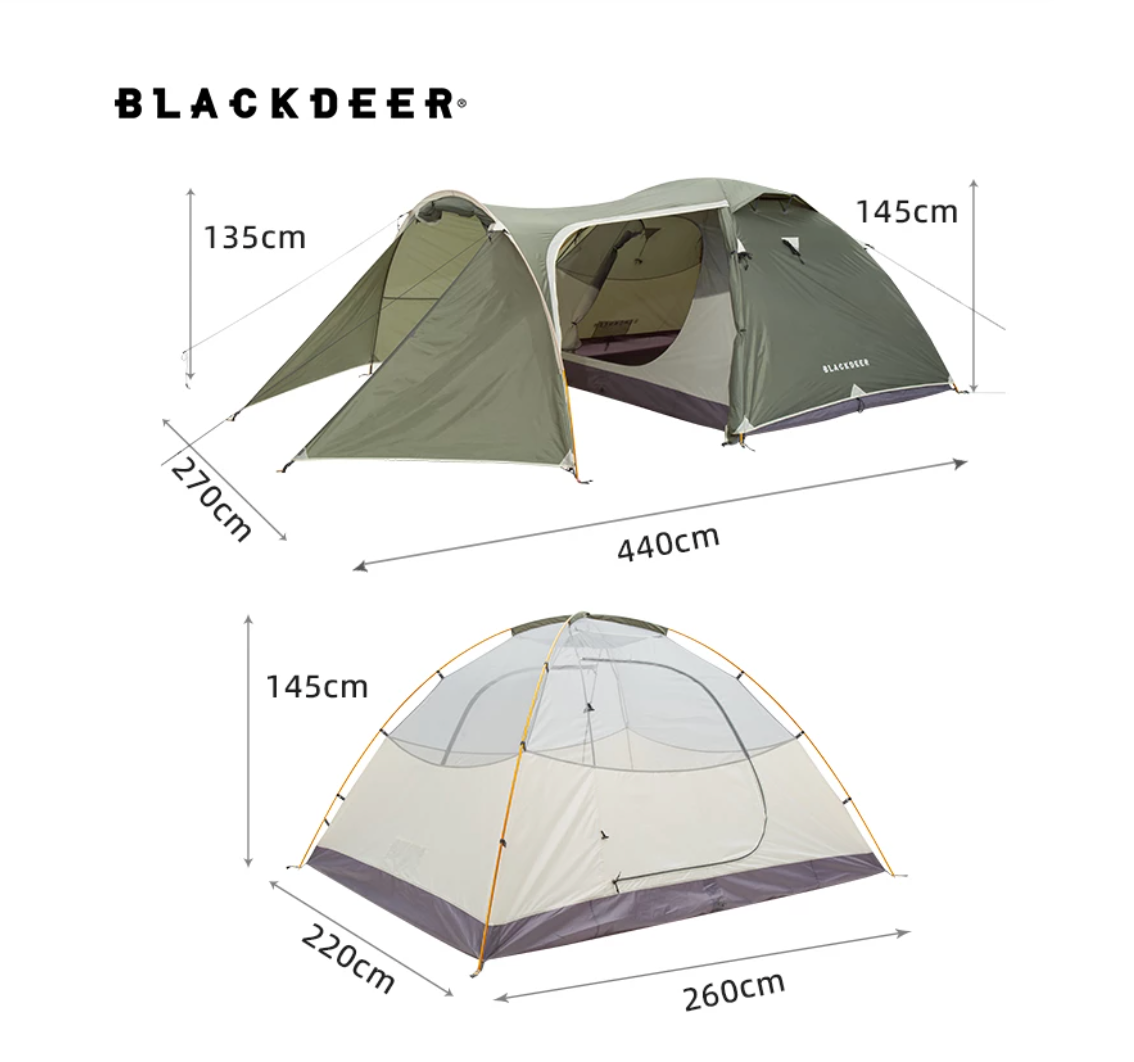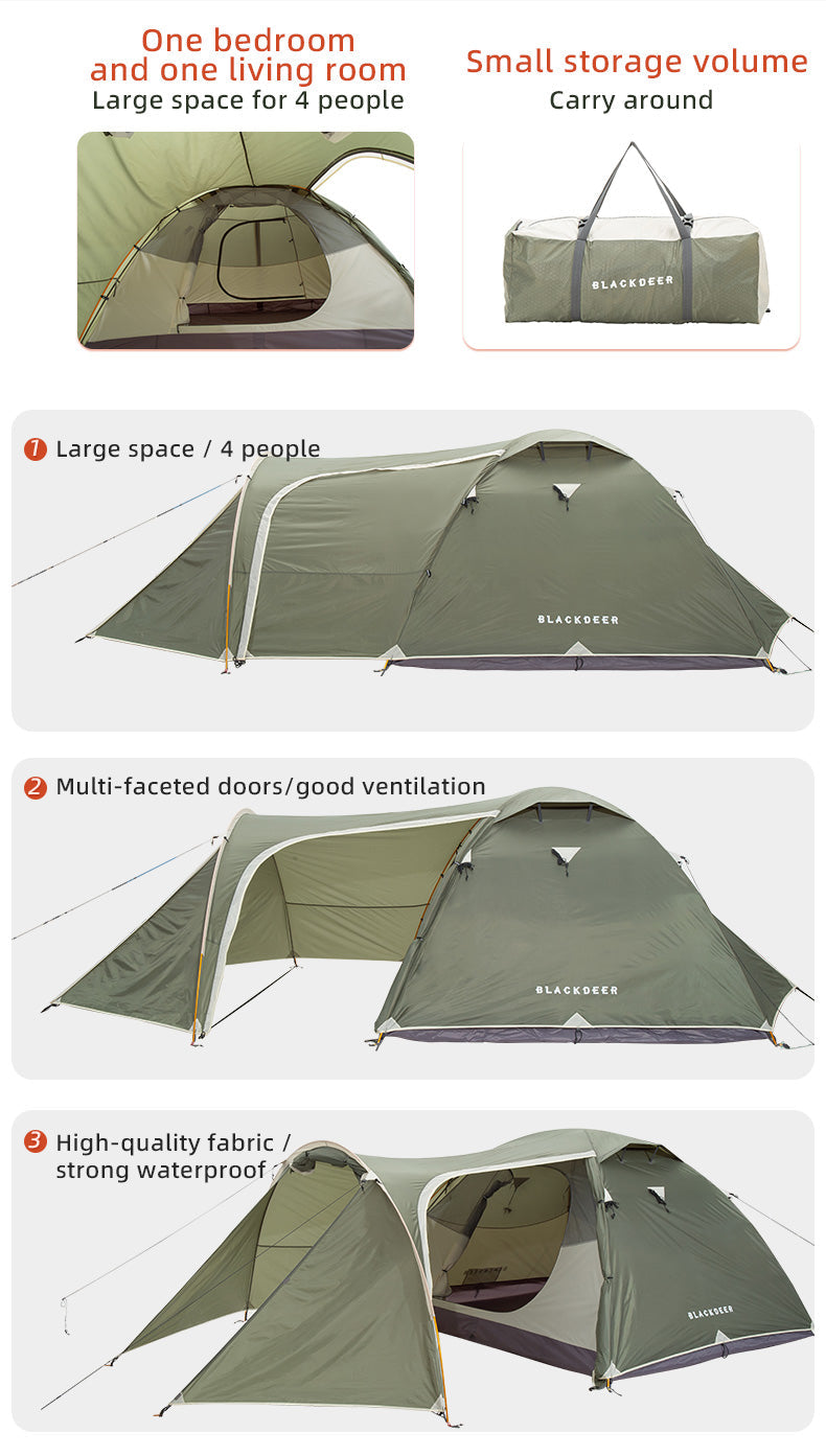 เต็นท์ครอบครัวขนาดกลาง นอนได้ถึง 4 คน มีที่พักผ่อนด้านหน้าเป็นลักษณะอุโมงค์ ทำให้ได้ความเป็นส่วนตัว และกันฝนสนิท มีที่ระบายอากาศด้านบน เสาเต็นท์วัสดุอลูมิเนียม รับประกัน 3 ปี