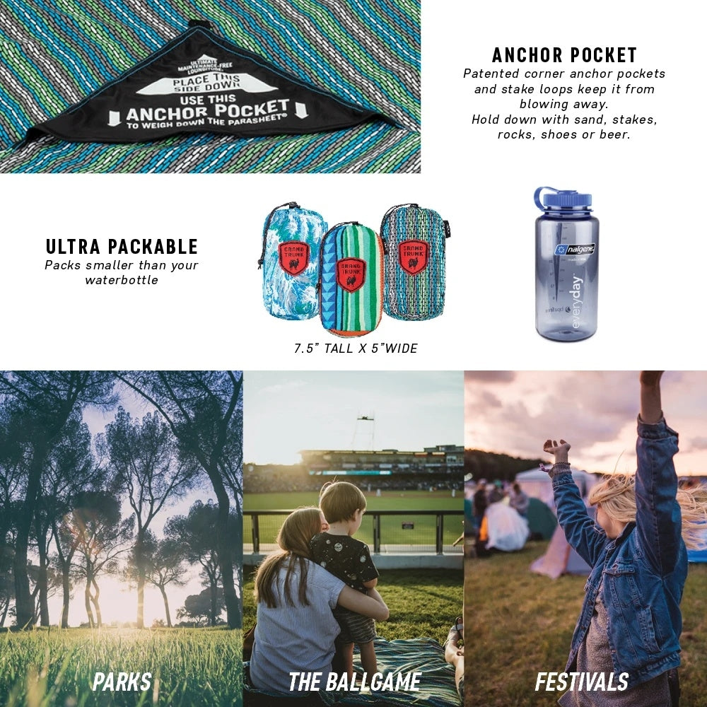 แผ่นปูพื้นผจญภัยพร้อมการกันน้ำ ที่ออกแบบมาอย่างสมบูรณ์แบบโดย Grand Trunk ได้รับการจดสิทธิบัตรแล้ว ไอเท็มที่จำเป็นสำหรับการพักผ่อนในงานเทศกาลดนตรี ตั้งแคมป์ หรือ ชายหาด เคลือบด้วย PU เพื่อการกันน้ำให้พื้นที่นั่งแห้งตลอดเวลา การออกแบบกระเป๋าสมอที่ได้รับการจดสิทธิบัตรช่วยต่อสู้กับลมทำให้แผ่นปูพื้นคุณเอยู่กับที่ ในขณะที่ห่วงมุมแผ่นปูพื้นที่เพิ่มเข้ามานั้นเหมาะอย่างยิ่งสำหรับการใช้งานบนพื้นดินที่มั่นคง แผ่นปูพื้นมีขนาดกระทัดรัดพกพาง่าย และกางออกได้อย่างรวดเร็ว
