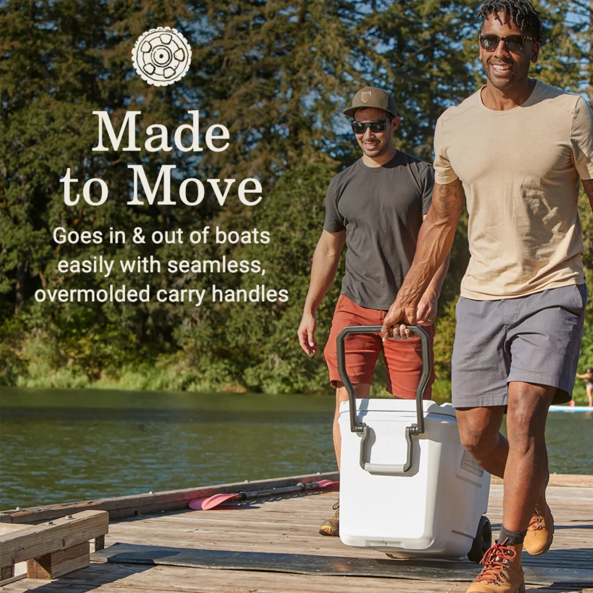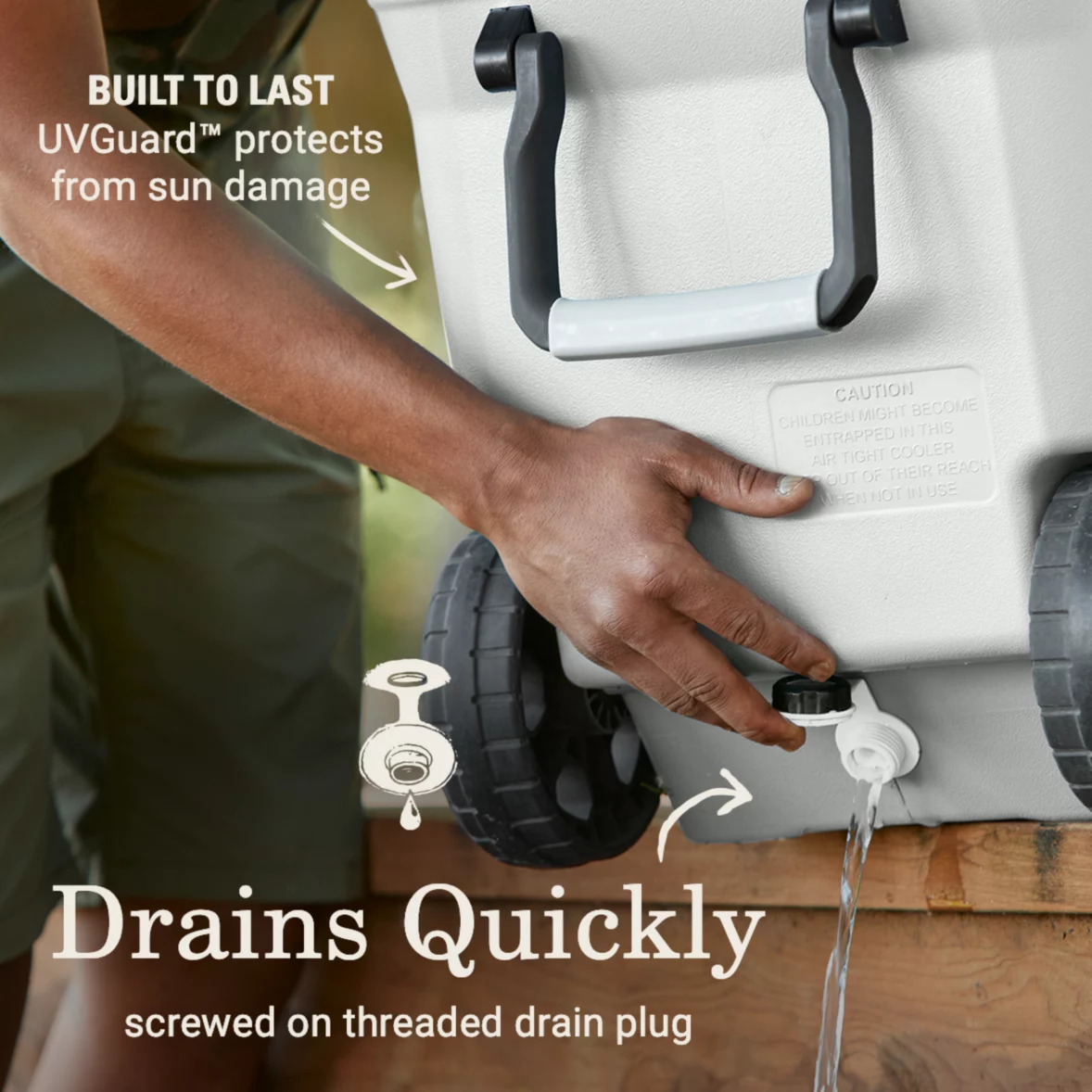 Cooler ขนาด 100 qt (95 ลิตร) แบบมีล้อลาก ที่ใข้งานได้อย่างสะดวก แข็งแรง ทนทาน ด้วยบานพับสแตนเลส พร้อมเคลือบสาร UVGuard ช่วยป้องกันแสง UV และยืดอายุการใช้งาน ให้คุณใช้งานกลางแจ้งได้อย่างไม่ต้องกังวล